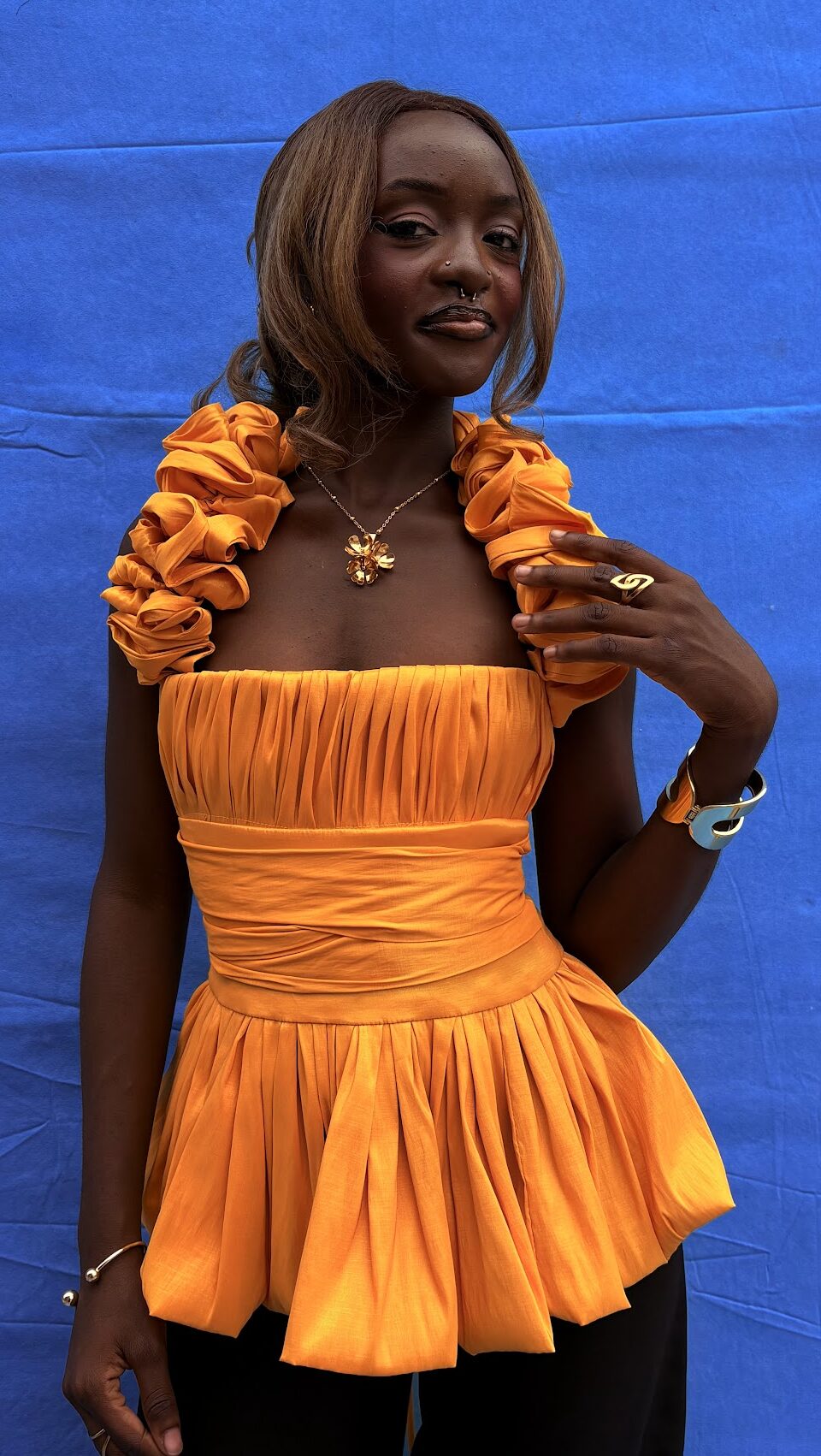 Skirt: High-waisted, chocolate brown bubble silhouette with dramatic volume
